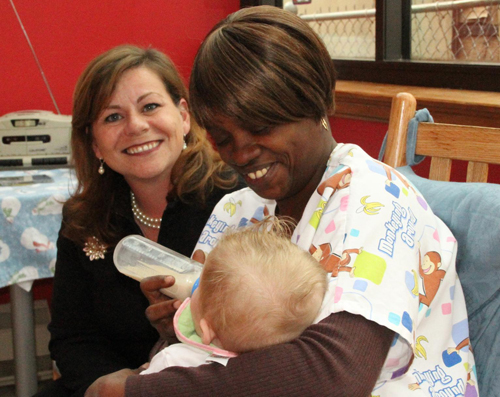 Photo Caption: (left to right) Elene Balasis, director of Human Resources at Comodo, looks on as Hudson Cradle nurse, Wanda Hayes, feeds a contented baby during a visit to the infant group home in Jersey City.
