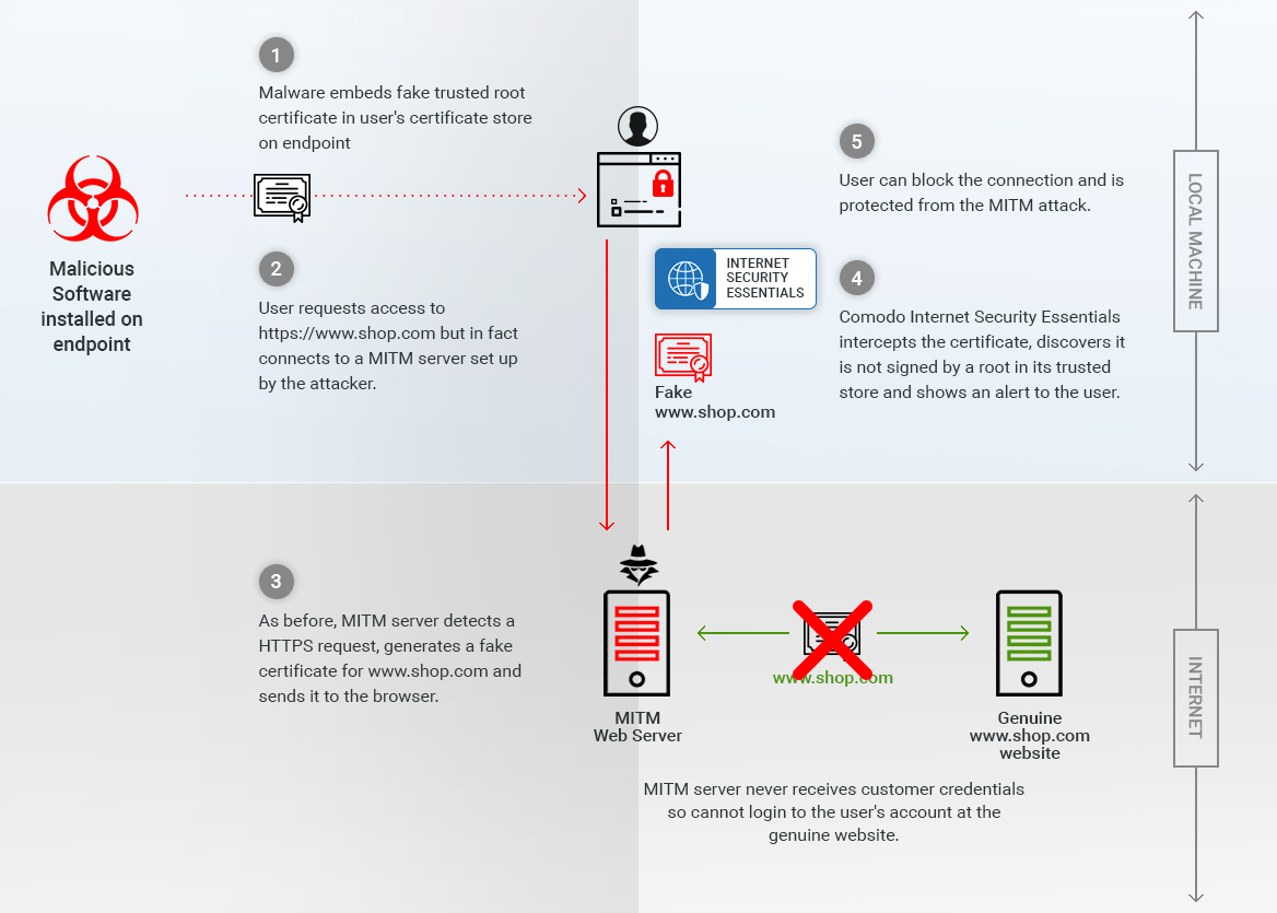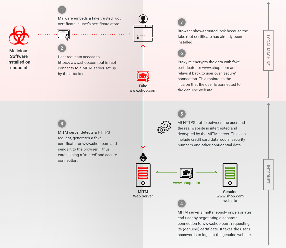 By injecting a fake root certificate into the Windows certificate store, malicious actors can often fool browsers into trusting a connection to a server operated by an attacker. This is known as certificate root poisoning and is the most commonly used technique for launching man-in-the-middle attacks. If successful, all data sent from your browser would be routed through the attacker’s server. The diagram on the right shows a typical man-in-the-middle attack:
